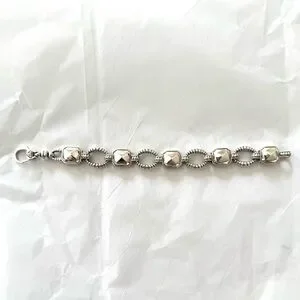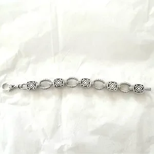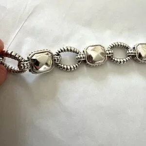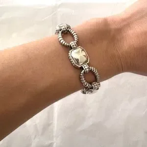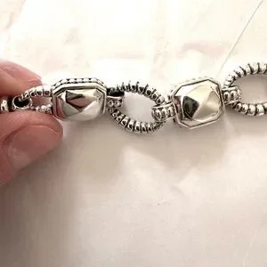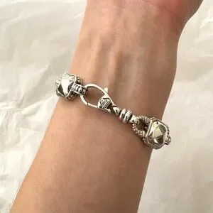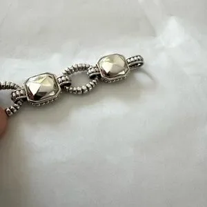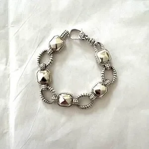 Great condition- minor scratches to metal throughout. Lagos Sterling Silver Rocks Station Link Bracelet has polished and faceted stations framed by signature caviar beading for a bold yet timeless look. Finished with an oversized lobster clasp, this sterling silver piece brings effortless sophistication to your jewelry collection.