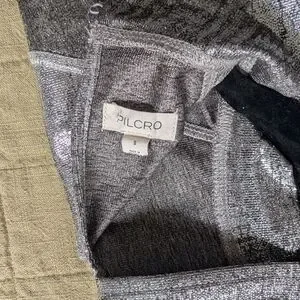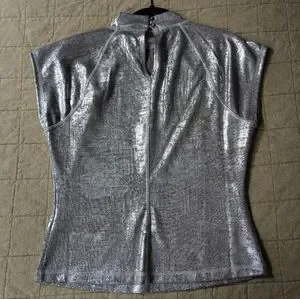 Pilcro cap-sleeve mock-neck silver metallic top. Size small, see photos for measurements. Material is a poly blend with just a little bit of stretch to it.