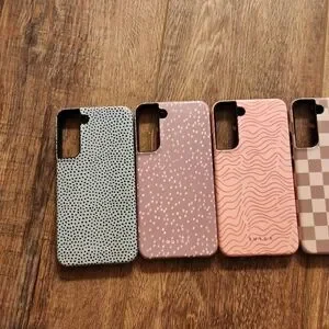 - blue with design, purple with design, pink with design, and checkered