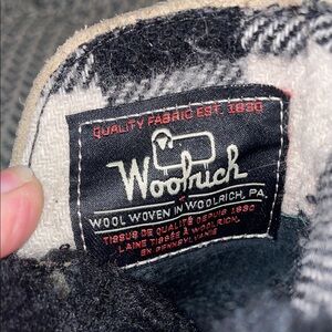 Woolrich heeled ankle boots with a shearling cuff. Leather and textured upper with buckle strap detail. Stacked block heel and lug sole for traction. Chic, versatile style for cool-weather outfits.