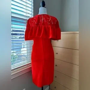 Chic red midi dress with lace accents. Features a stylish ruffle design. Perfect for any occasion. NO RETURNS FOR SIZING, SO PLEASE ASK FOR MEASUREMENTS BEFORE PURCHASING.