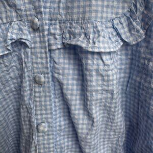 Light blue gingham dress with ruffle yoke and peter pan collar. Button-front closure and gathered skirt for gentle volume. Puff sleeves add a sweet, playful touch. Soft textured fabric for comfortable wear.