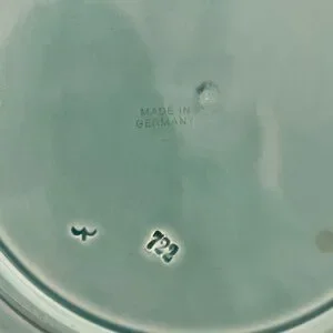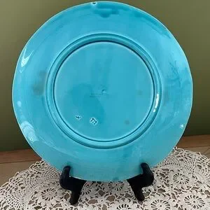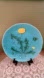 This item is a vintage German majolica plate, hand-painted and featuring a dandelion design with a turquoise or cornflower blue glaze.