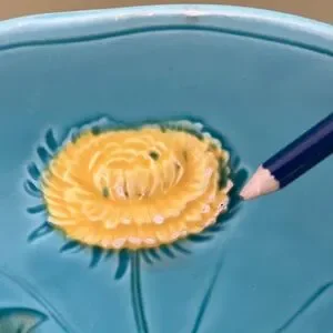 This is a beautiful plate and it has been well loved and is worn. The glaze & paint is worn off on the raised pattern from the yellow dandelion flower, down to areas of the dandelion greenery and worn on edges. Please look at photos to make sure that you are okay with that. It does not have any cracks only wear off of glaze & paint in areas as shown. And it is priced accordingly.