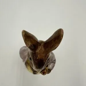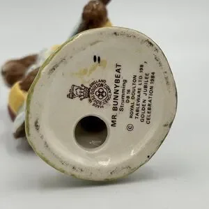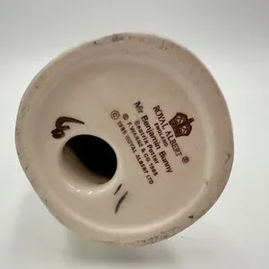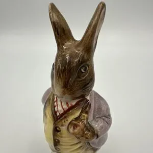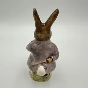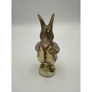 This Vintage 1989 Beatrix Potter Mr. Benjamin Bunny figurine from Royal Albert England is a charming piece of decorative pottery. With a multi-color design and glossy finish, this porcelain figurine depicts Benjamin Bunny, a beloved character from Beatrix Potter's stories. Manufactured in the late 20th century, this art pottery piece is an original licensed reproduction, showcasing the intricate craftsmanship and artistic style of that era. Made in the United Kingdom, this collectible figurine is a unique addition to any Beatrix Potter or pottery enthusiast's collection.