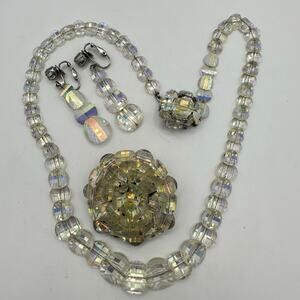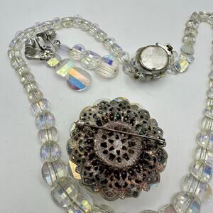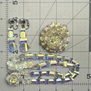 1950s vintage glass aurora borealis AB graduated beaded necklace earrings brooch