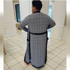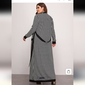 Make a statement in this stylish two-piece outfit featuring a classic black and white houndstooth pattern. The set includes a long open-front duster with black trim and matching comfortable leggings.