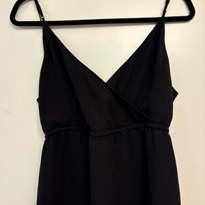 Chic black camisole with V-neck. Delicate straps and cinched waist. Perfect for versatile styling.