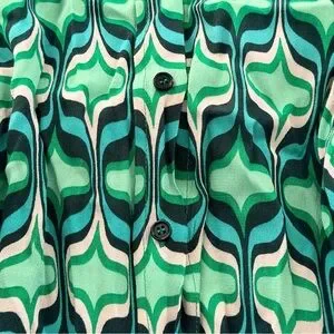 Vivid green and teal abstract wave print. Button-front styling with soft, flowing fabric. Eye-catching pattern for wardrobe rotation.