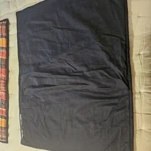 Pottery Barn quilt with a classic plaid design. Rich red and warm yellow blocks contrast with navy. Navy trim frames the piece for a finished look. 2 matching standard shams. Queen quilt.