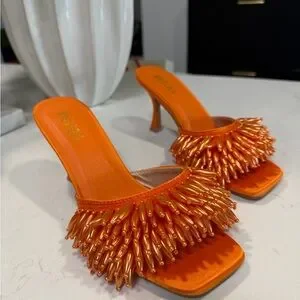Bold statement heels by Miss Lola featuring a vibrant orange satin finish and dramatic beaded fringe embellishment across the front strap. These eye-catching mule sandals have a square toe silhouette and elegant kitten heel, making them perfect for special occasions, vacations, or styling with statement outfits.
