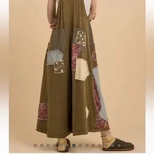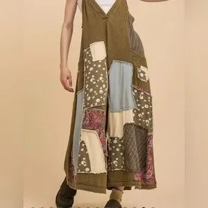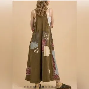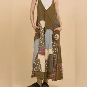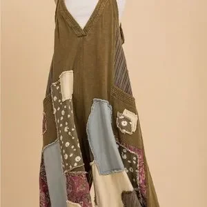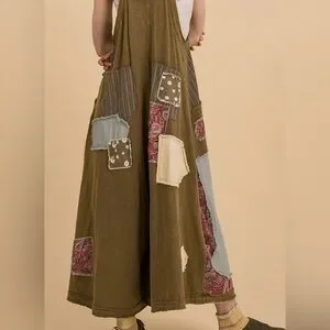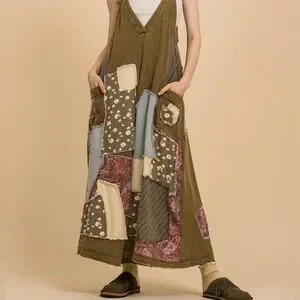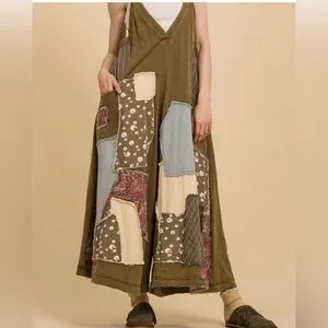Vintage-inspired patchwork wide leg jumpsuit featuring a deep V-neckline and oversized fit.