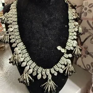 Bold floral-link necklace with dangling tassel beads. Silver-tone finish with dark bead accents. Statement piece for elevated outfits. Lightweight and eye-catching.