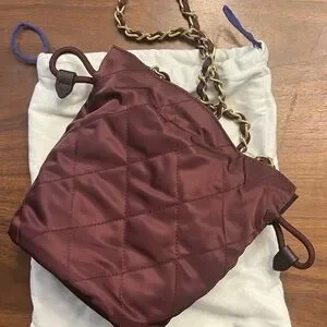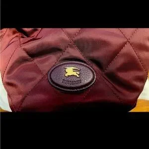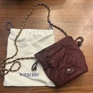 Authentic MSRP $970 Burberry quilted crossbody bag in rich burgundy. Lightweight nylon construction with a gold-tone chain strap. Elegant and versatile for day-to-night wear. Features signature Burberry logo accent for authentic style.