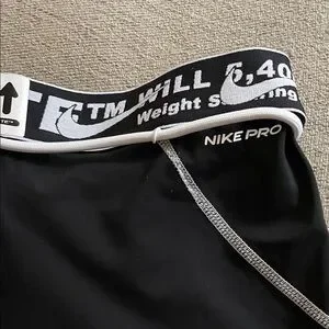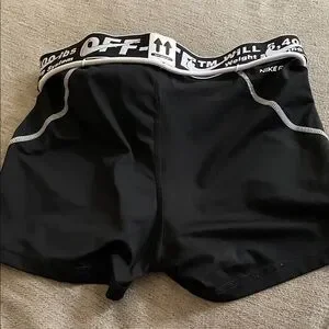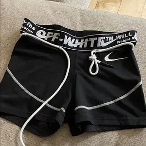 Off White/Nike collab. These blk and white Nike pro- Offwhite biker shorts. Had drawstring to show off collab. And white decorative seaming.Chic black athletic shorts with bold Off-White branding. Perfect for workouts or casual wear.