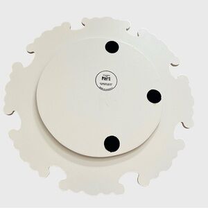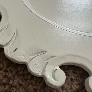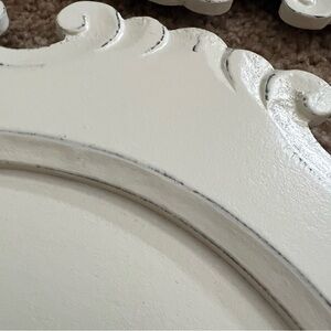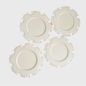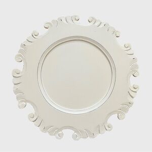 Set of 4 Antiqued White Artisan Carved Wood Charger Plate from Pier 1 Imports. These decorative plates are 13 inches in diameter and feature an intricate, ornate scrollwork design along a scalloped rim. French or Baroque-inspired with antiqued white finish and relief detailing.