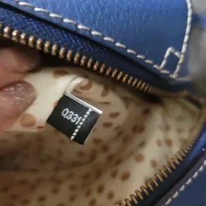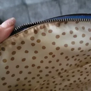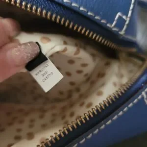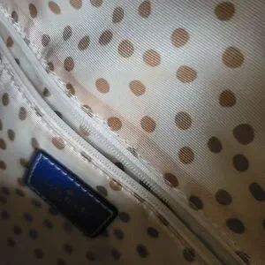 Features: Detachable, adjustable crossbody strap and top handles. Polka dot interior lining, contrast stitching, and double zippers.