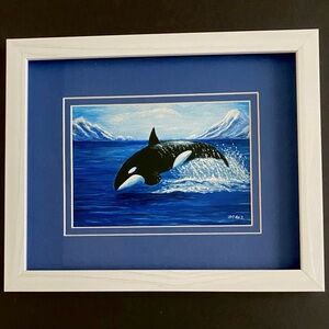 This beautiful art print featuring a stunning orca was originally painted on a 5x7 canvas board and now, is available in a print. Print has been matted and framed ready to be displayed in any room.