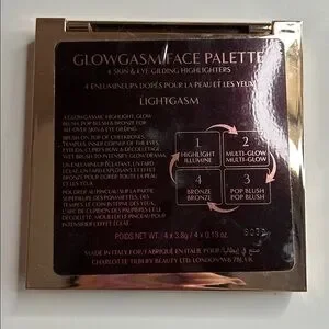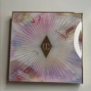 Charlotte Tilbury compact featuring a sunburst motif. Pastel watercolor wash in pink, purple, blue and cream. Gold logo and radiating lines at center. Elegant collectible makeup palette styling. Swatched. Discontinued.