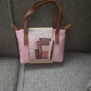 Stylish pink mini travel kit bag, with brown handles. Includes makeup essentials. Perfect for jet-setters.