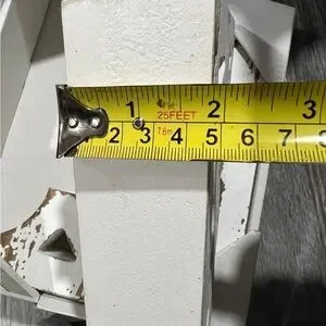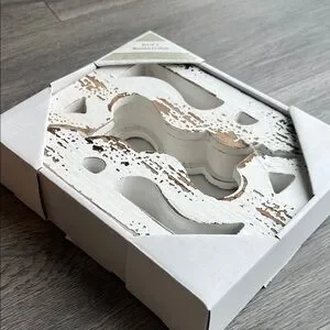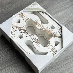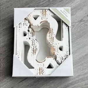 - Decorative wooden wall piece with a rustic white and brown finish. Perfect for adding charm to any room.