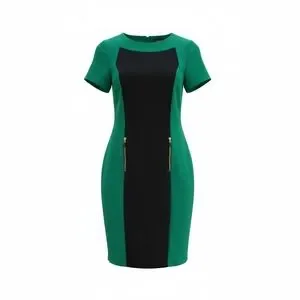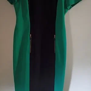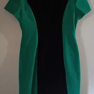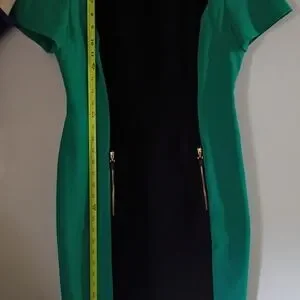 Chic mini dress with bold green and black panels. Perfect for stylish outings.