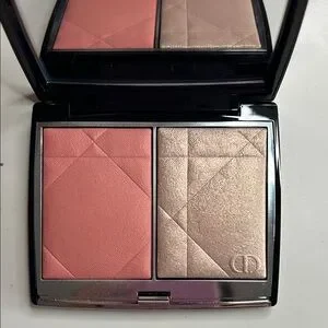 Two-pan Dior cheek palette. Coral pink blush for natural color. Champagne highlighter for luminous sheen. Smooth, blendable finish. Compact mirror included for easy application. Swatched.