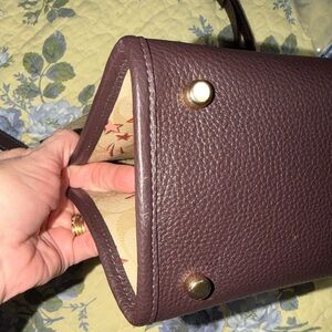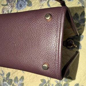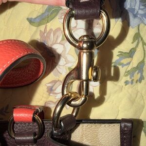 Stylish Coach satchel with signature canvas. Cream body with red accents. Perfect for everyday elegance.