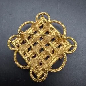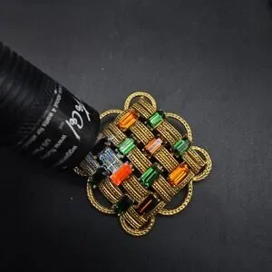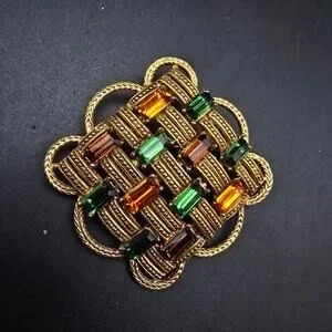 This vintage Florenza brooch features a 2" x 2" gold tone woven design with green, brown and orange rhinestones