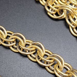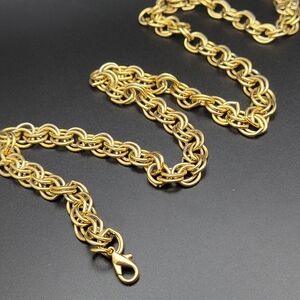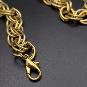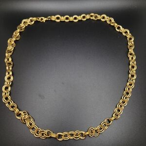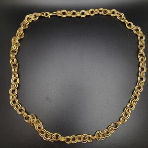 Eye-catching gold tone Byzantine chain necklace. Features a rich gold color and intricate interlocking links for a luxurious look. Lightweight and versatile for everyday or special occasions. Secure lobster clasp for easy wear.