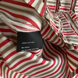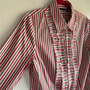Carlisle women's button down long sleeve shirt with a double row of vertical ruffles on either side of the front and ruffles at the cuffs. White, brown, and red stripes and a round hem. 100% cotton.