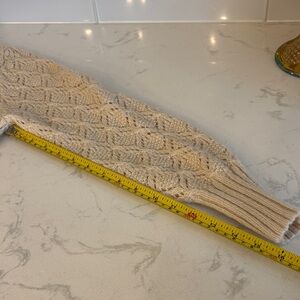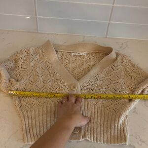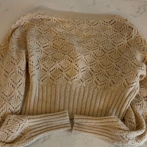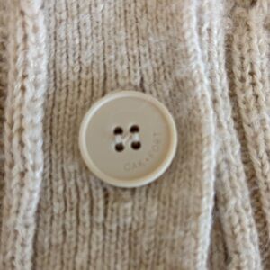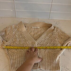 Elegant cream cardigan with intricate knit pattern. Features a button-up front. Perfect for layering. Excellent condition.