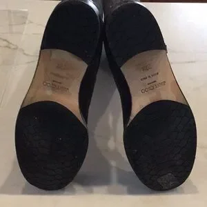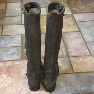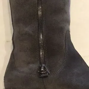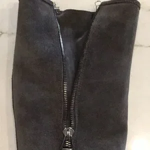 Tall suede gray boots with a streamlined silhouette. Side zip entry for easy wear. Low stacked heel and round toe. Versatile style for day or night. Comes with duster bag and foam inserts.