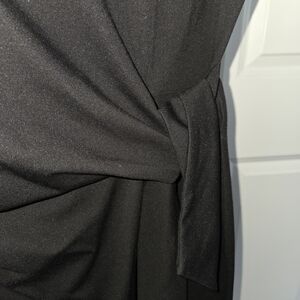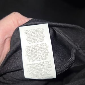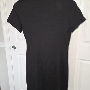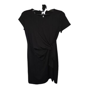Black knit crew neckline, cap short sleeves, knot detail. Cute with sneakers or heels.