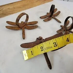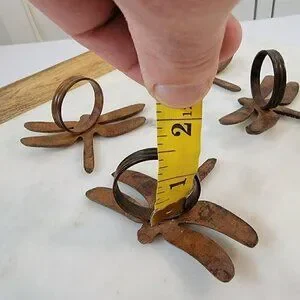 The napkin ring face--the dragonfly--measures about 3-3/4" across and just under 3" long. Napkin rings are just over 1-1/2' in diameter. Ring is soldered at an angle, so that the ring is at a diagonal when placed on a napkin. Each ring has a carved symbol onto the backside. A warm bronze color
