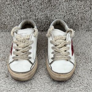 Stylish white kids sneakers featuring a sparkling pink glitter star. Comfortable padded collar and cushioned sole for all-day wear. Easy lace-up design for a secure fit. Fashionable and playful for everyday outfits.