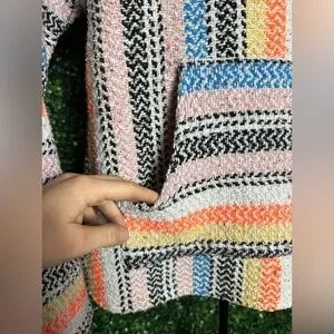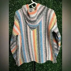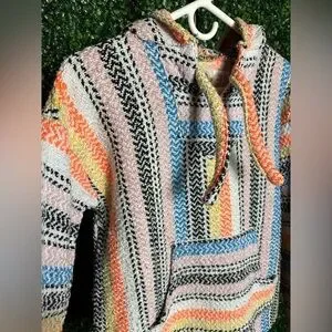 Vintage 90s Earth Ragz Baja hoodie. Blue, yellow, orange, pink, multicolored pattern. Drawstring and front pocket. Unisex sex small.