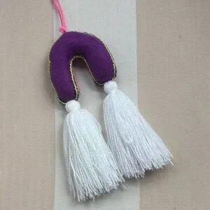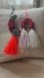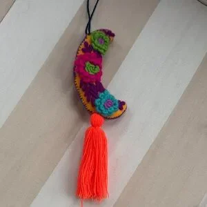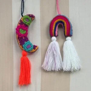 Set of two embroidered tassel charms. One crescent moon with floral embroidery and bright orange tassel. One rainbow with layered colors and double white tassels. Lightweight and vibrant. Ready to hang.