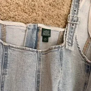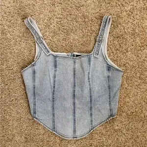 Light faded blue denim corset tank with vertical seaming. Adjustable shoulder straps with metal hardware. Slightly curved hem for a tailored fit. Easy-to-style casual staple.