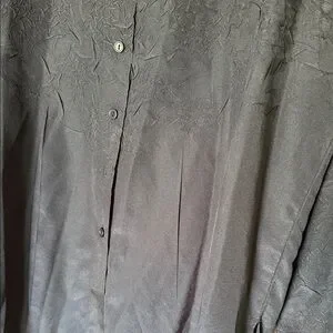 Chico's black blouse with textured crinkle patterned texture on sleeves and upper body. Satin-look collar and button front. Flowing, slightly A-line silhouette. Lightweight fabric with subtle sheen.