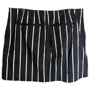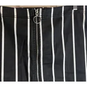 Volcom Frochickie striped mini skirt in women’s size 14W. Features a flattering high waist design with a full front zipper and bold black and white vertical stripe pattern.