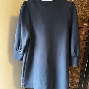 Elegant navy top with a charming cream ruffle collar. Ideal for a sophisticated style.