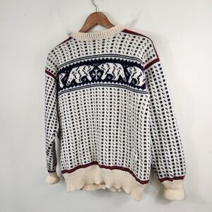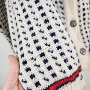 Classic L.L. Bean wool cardigan with elk motif. Ivory base with navy pattern and red trim. Button-front closure. Ribbed cuffs and hem. Timeless outdoor knit style.