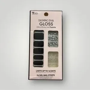 Dashing Diva Gloss Ultra Shine Gel Palette- Black, Gold Glitter and Leopard Glitter Print with a hand crocheted gray bag. Color scheme is called “Ambition”. New. My closet has an auto-discount of 20% on all bundles. The more you bundle, the bigger the discount.