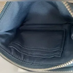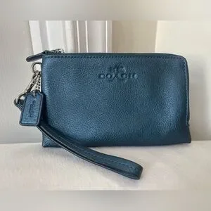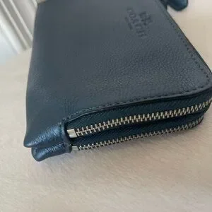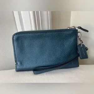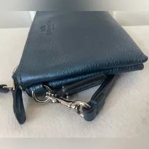 Compact leather wristlet with top zip closure. Embossed Coach logo on front. Detachable wrist strap and logo hang tag. Smooth pebbled leather finish.