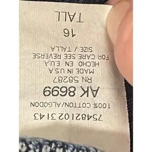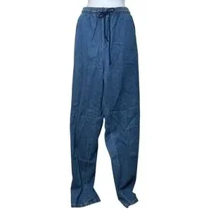 Vintage high-waisted denim pants offer a relaxed fit with a comfortable elastic waistband and adjustable drawstring. Crafted from 100% cotton in the USA, these medium wash jeans feature a classic straight leg silhouette and functional side pockets. The tall sizing and durable denim construction make them a versatile staple for casual everyday wear.
