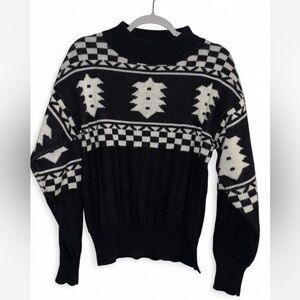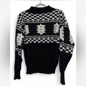 Super cute vintage style black and cream patterned sweater with Nordic / fair isle inspired design. Perfect cozy cottagecore or winter aesthetic piece. Thick knit with a high crew neckline and unique geometric pattern throughout.