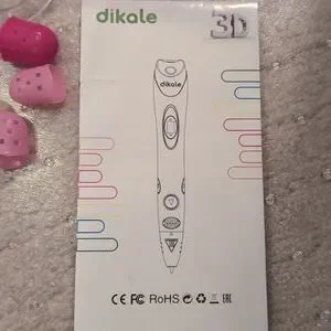 Dikale 3D Pen and Filament. A 3D pen, stand, small and large mat, finger protectors, charging cable, instruction manual and a ton of filament. Most of the filament is new in plastic. This is a great starter tool before moving to a 3D printer (which is what we did).