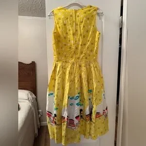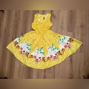 Charming yellow dress with floral pattern. Features a playful print at the hem. Sleeveless design with a fitted waist.