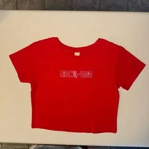 Red Messy Bun graphic crop top featuring a sparkling “Nice-ish” rhinestone design across the front. Soft 100% cotton fabric with a comfortable stretch and flattering cropped fit. Perfect casual piece to pair with jeans, shorts, or joggers for a fun everyday look.